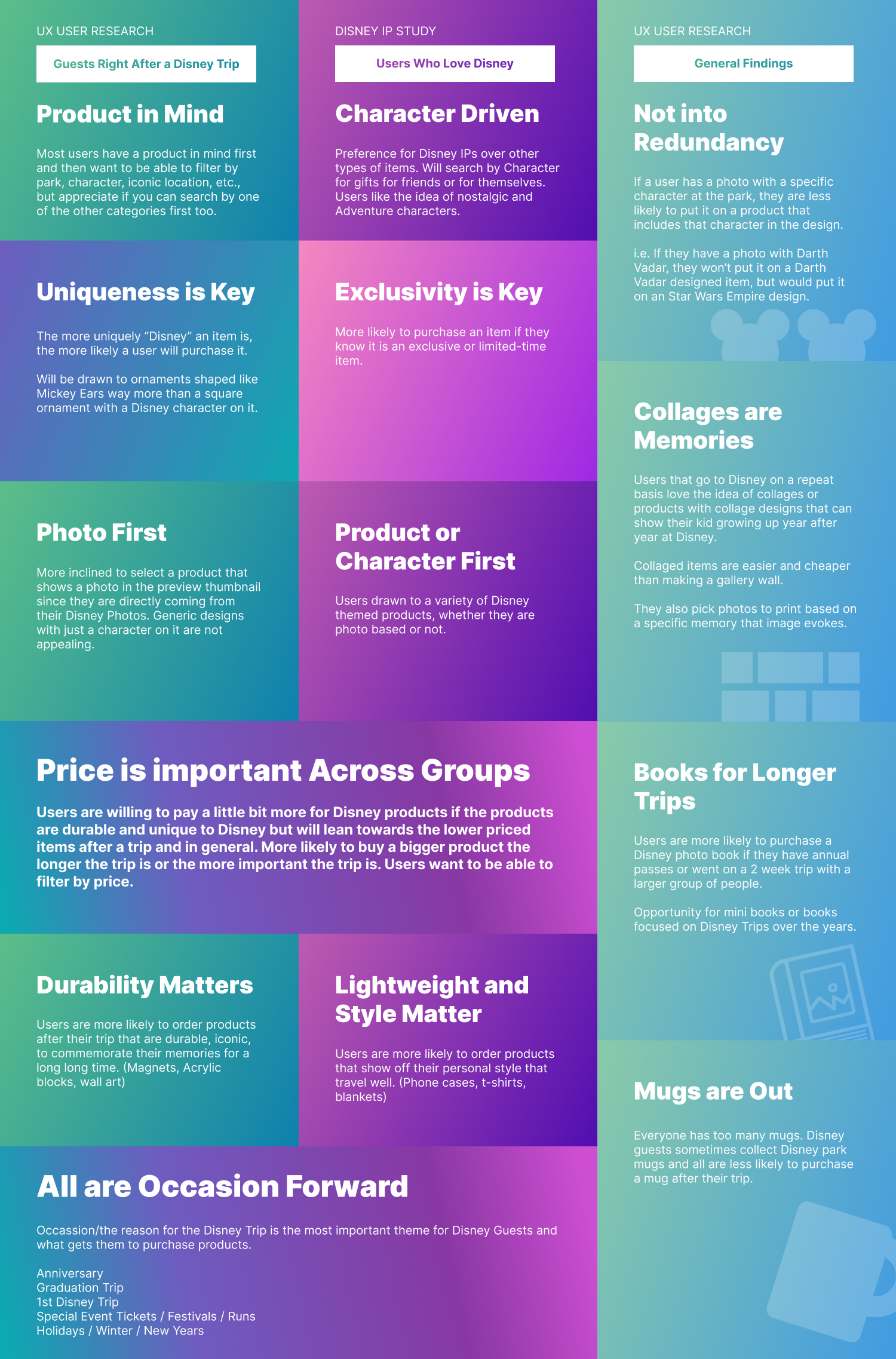 Our Customer Insights Team conducted a quantitative survey sent out to users who were fans of the Disney Brand to get insights on which characters or products were the most enticing. Analyzing both testing results, I constructed a comparative list of the top purchase driving factors for each so that our designs and our experience would meet both customers adequately. The top takeaways were: